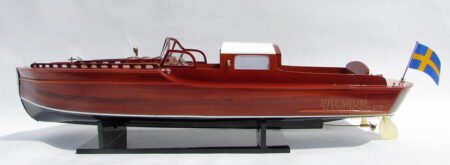 | • The model is 100% scratch built with planks on frame construction method from the drawings. The hull is made of wood and painted with white below waterline and stained hull as the origin real race boat. The deck is joined with tiny strips of wood and that you still can see the natural wood grains. The hull is waterproof, hollow and ready for installing motors, servos.