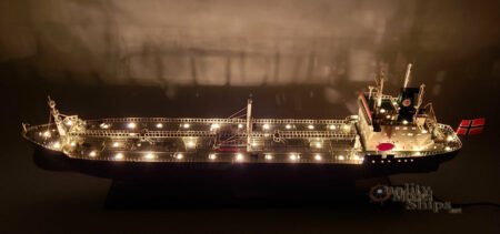 • The hull is made of wood and painted with black and red, grey deck, white cranes.... This model is not a kit and ready for display.