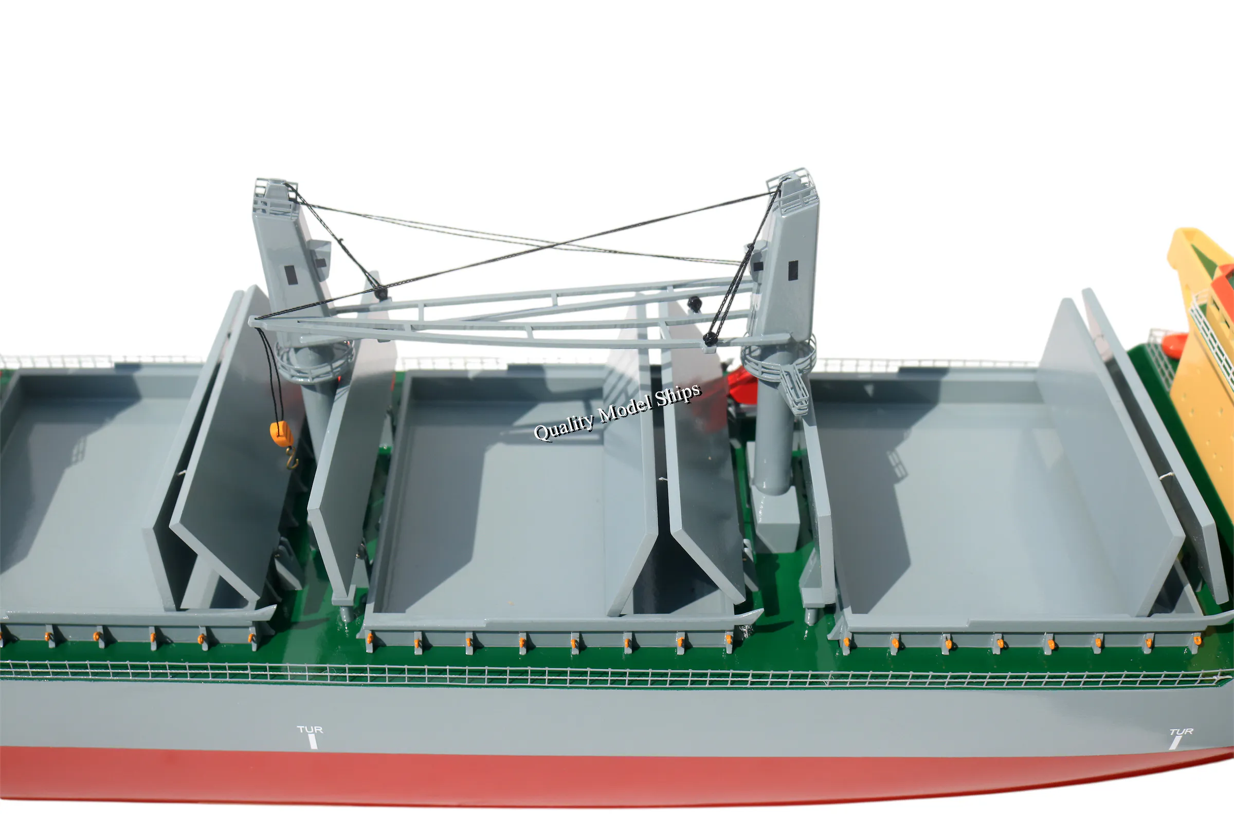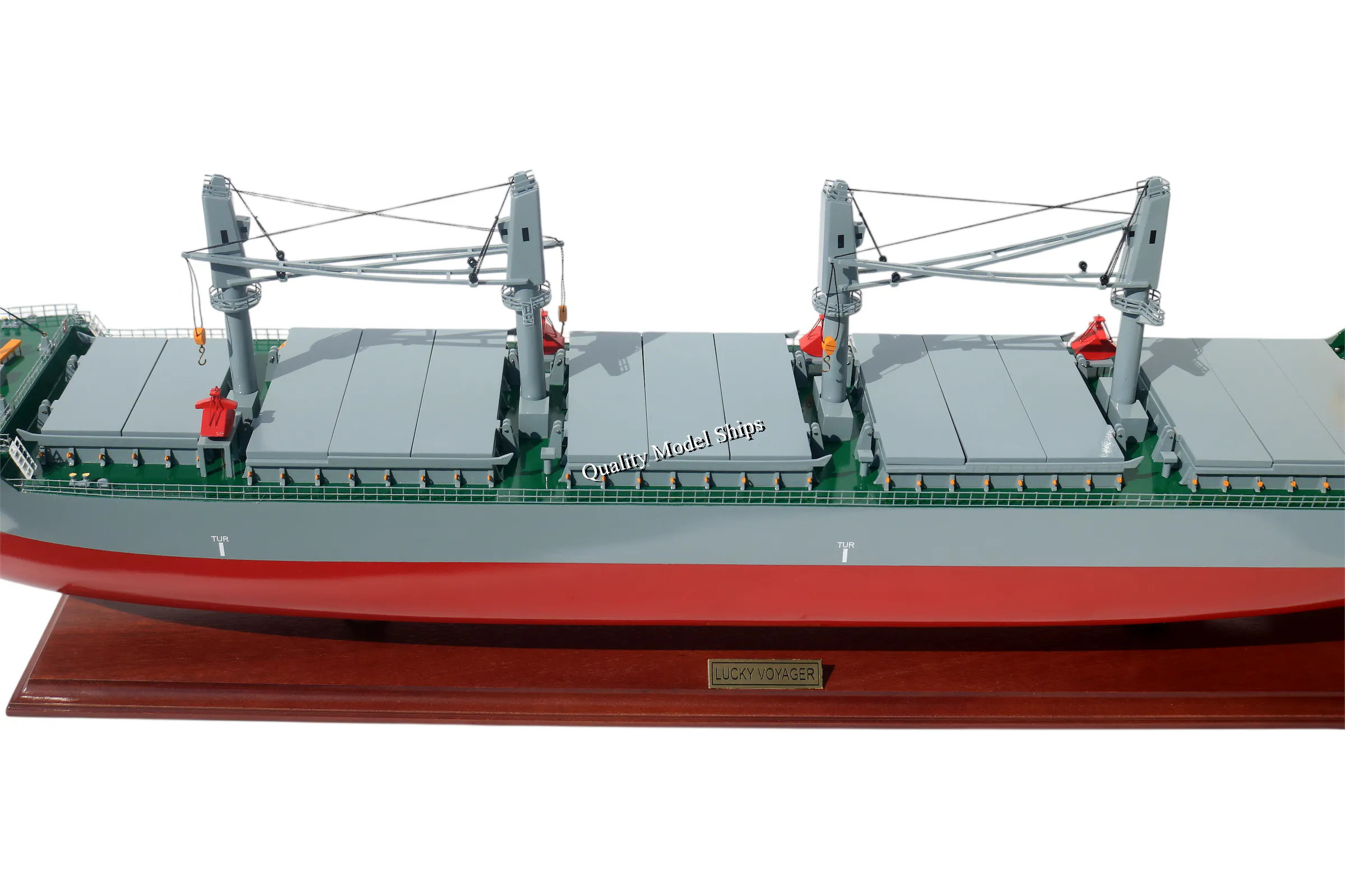 • The hull is made of wood and painted with black and dark red, red deck, yellow cranes, white house.... This model is not a kit and ready for display.