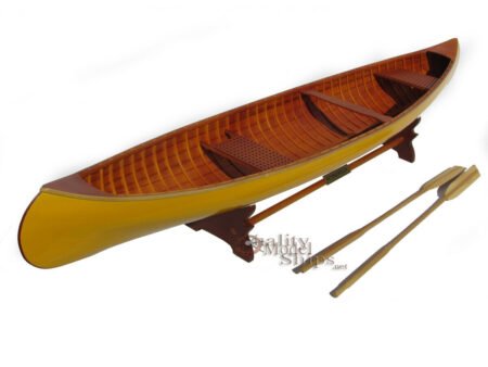 | • The model is 100% scratch built with planks-on-frame construction method by master craftsmen. The building of this model is exactly like building the full size canoe but the only different thing this is a scale model. The hull is made of wood and painted yellow outside. The inside hull is constructed with ribs as the original boat. Model comes with a pair of oars and a brass name plate on the base like shown photos.