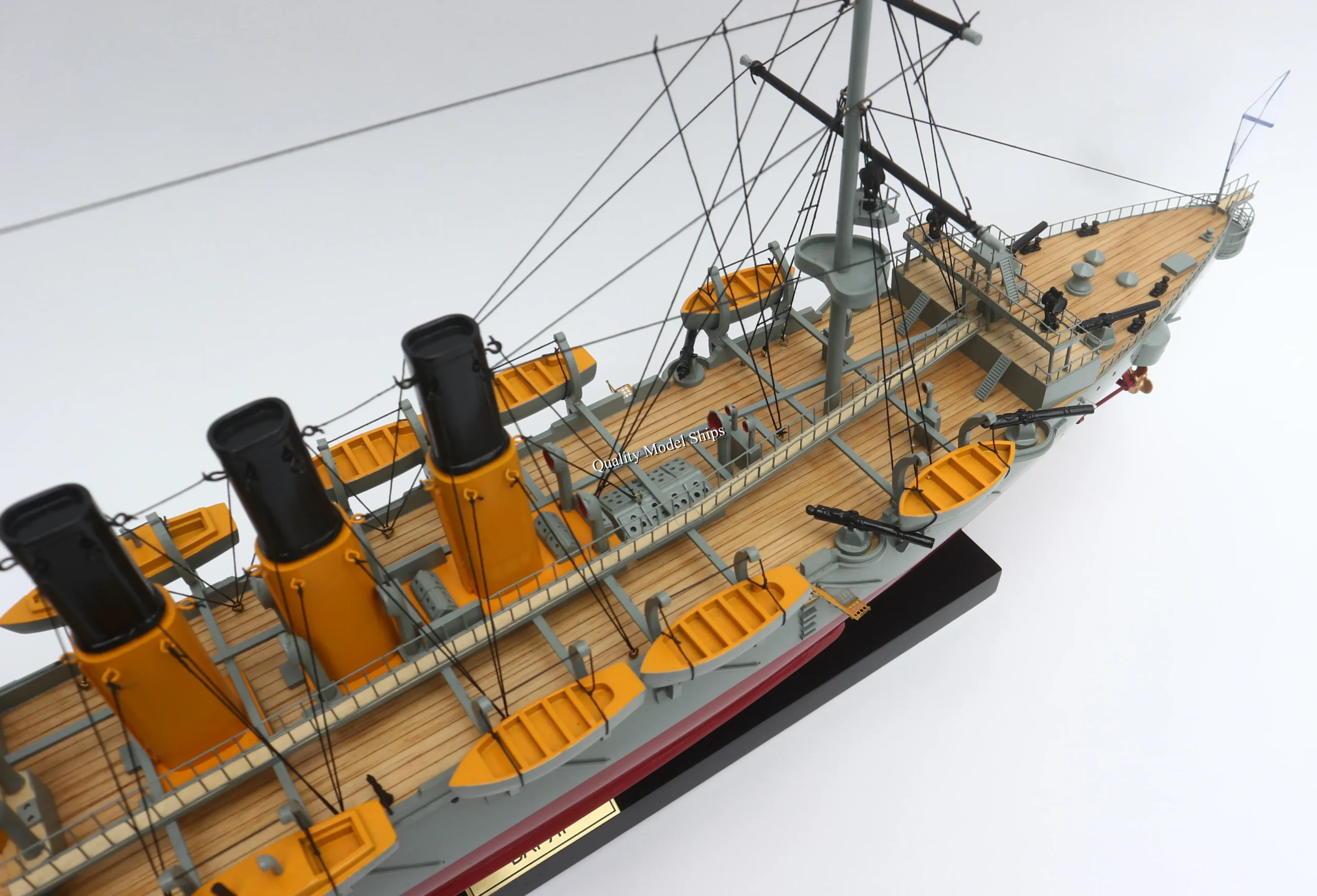 • This model is not a kit and is ready for display. The model comes with a display base and a brass name plate as shown in the photos.• Specifications: 31.49"L x 5.11"W x 12.60"H or 80L x 13W x 32H (cm)• Item ship from our warehouse in Houston, Texas or could be shipped directly from our factory if they are not available in our warehouse. We often ship by UPS/ FedEx.• Buyer from Alaska, Puerto Rico or Hawaii, please contact us for extra shipping cost.• International buyer pays any duty/ import tax.Return/ Exchange Policy• For some reasons if you wish to return the item, please consider not to open the item out of the wooden crate or open the item out of the styrofoam. You can open the carton box, lift up the whole wooden crate, and check the models that are packed in the wooden crate. Since the items are packed in solid styrofoam, you can open the carton box, lift up the top part (styrofoam lid), and check the model. Please do not cut any strips or take the model out of the wooden crate or out of the styrofoam. It is very risky to damage the item when you return if you open or remove the item from the wooden crate or the styrofoam. We only accept and refund in full when the model is returned in good shape.• Returned or exchanged products must be in brand-new, original condition, and have all original packaging, materials, and accessories.• Buyer pays return shipping.• 15% restocking fee might apply. | • The model is 100% scratch built with planks on frame construction method from the drawings.